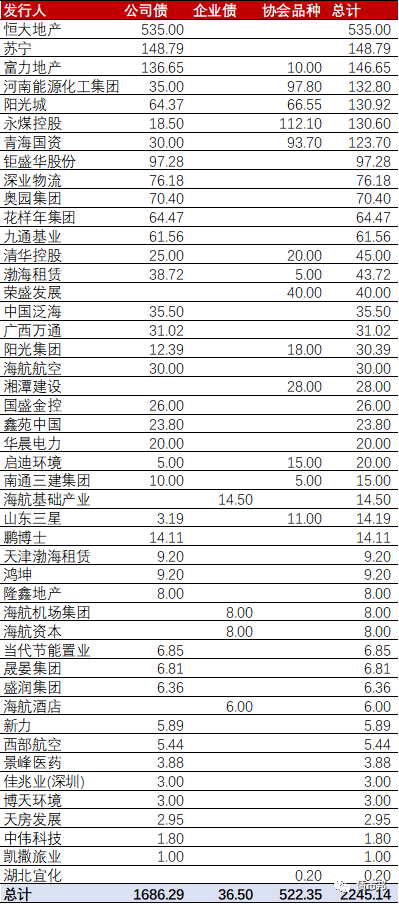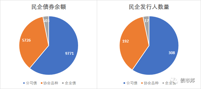 從存量上來看,民企發行人的數量是公司債(308家)>協會品種(192家)>企業債(17家);民企債券余額是公司債(9771億元)>協會品種(5726億元)>企業債(503億元)。