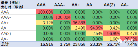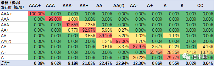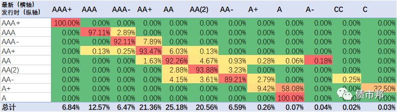 下面是2021年公司債券的隱含評級遷徙情況,橫軸為最新隱含評級情況,縱軸為發行時的隱含評級。