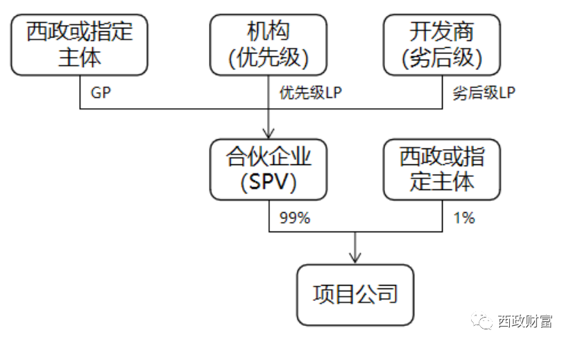1. 由西政或指定主體擔任GP,機構優先級LP、開發商劣后級LP共同設立合伙企業(SPV),西政或指定主體與SPV設立項目公司(因合伙企業不得100%持有有限公司的股權,因此1%的股權實際為代持性質)。