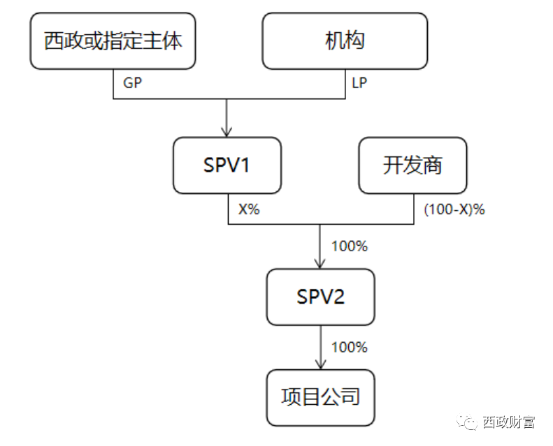 1. 西政及相關機構以合伙企業形式設立SPV1,SPV1與開發商共同持股設立SPV2,SPV2全資設立項目公司。
