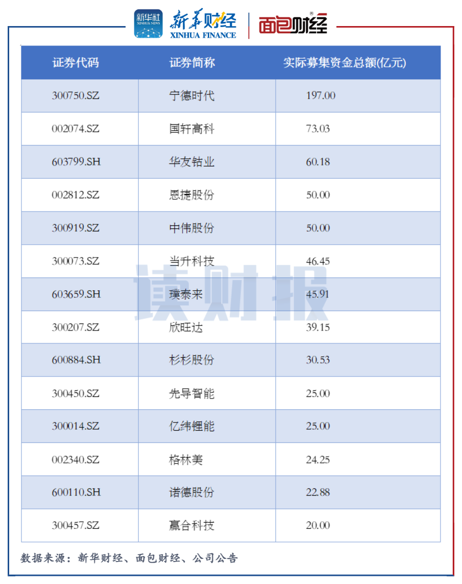 近年來,寧德時代、恩捷股份分別已通過定增完成募資197億元和50億元,而兩家公司各自又有450億元和128億元的定增方案正在申請中。此外,華友鈷業、諾德股份等7家公司均完成了2次及以上定增募資,需警惕鋰電池板塊中可能存在的過度融資風險。