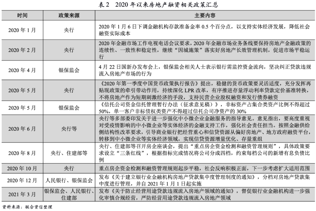 2020年8月20日,住建部和人民銀行在北京召開重點房地產(chǎn)企業(yè)座談會,研究進一步落實房地產(chǎn)長效機制并提出資金檢測和融資管理規(guī)則(簡稱“三道紅線”)。2020年12月,央行聯(lián)合銀保監(jiān)會發(fā)布《關于建立銀行業(yè)金融機構房地產(chǎn)貸款集中度管理制度的通知》,劃定銀行房地產(chǎn)貸款集中度“紅線”,明確對5檔機構分類分檔設置明確的房地產(chǎn)貸款占比上限、個人住房貸款占比上限。2021年2月24日,青島市自然資源和規(guī)劃局發(fā)布《堅決落實上級有關要求,部署2021年住宅用地供應工作》,提到嚴格實行住宅用地“兩集中”同步公開出讓,即集中發(fā)布出讓公告、集中組織出讓活動。隨后,國家自然資源局向全國22個重點城市下發(fā)通知,要求住宅用地出讓工作“兩集中”,不超過3次集中發(fā)布公告和組織出讓活動。