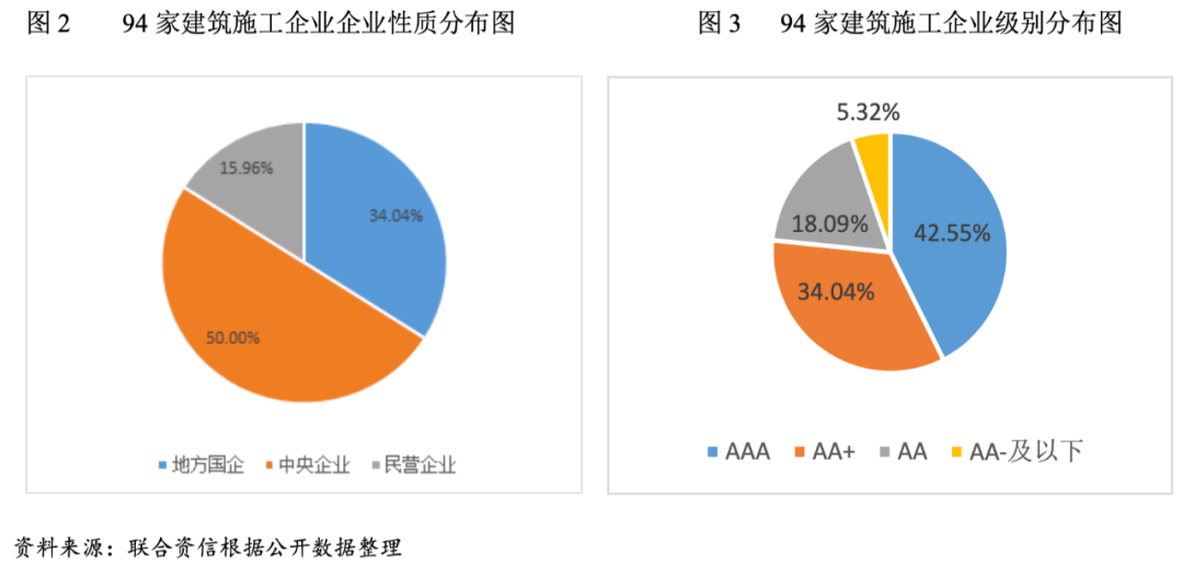 按級別分布看,建筑施工企業(yè)以AAA和AA+為主,其中AAA企業(yè)40家,AA+企業(yè)32家,AA企業(yè)17家,AA—企業(yè)2家,A+、A—和BB企業(yè)各1家。
