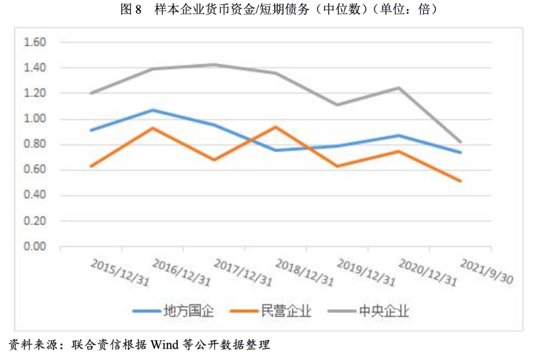 自2015年以來,建筑施工企業(yè)貨幣資金對短期債務的覆蓋程度整體呈波動下降趨勢。其中,中央企業(yè)貨幣資金對短期債務的覆蓋程度最高;民營企業(yè)貨幣資金對短期債務的覆蓋程度一直在1倍以下,其貨幣資金對短期債務覆蓋程度最低,2021年9月底該指標降至0.51倍,達到自2015年以來的最低值。