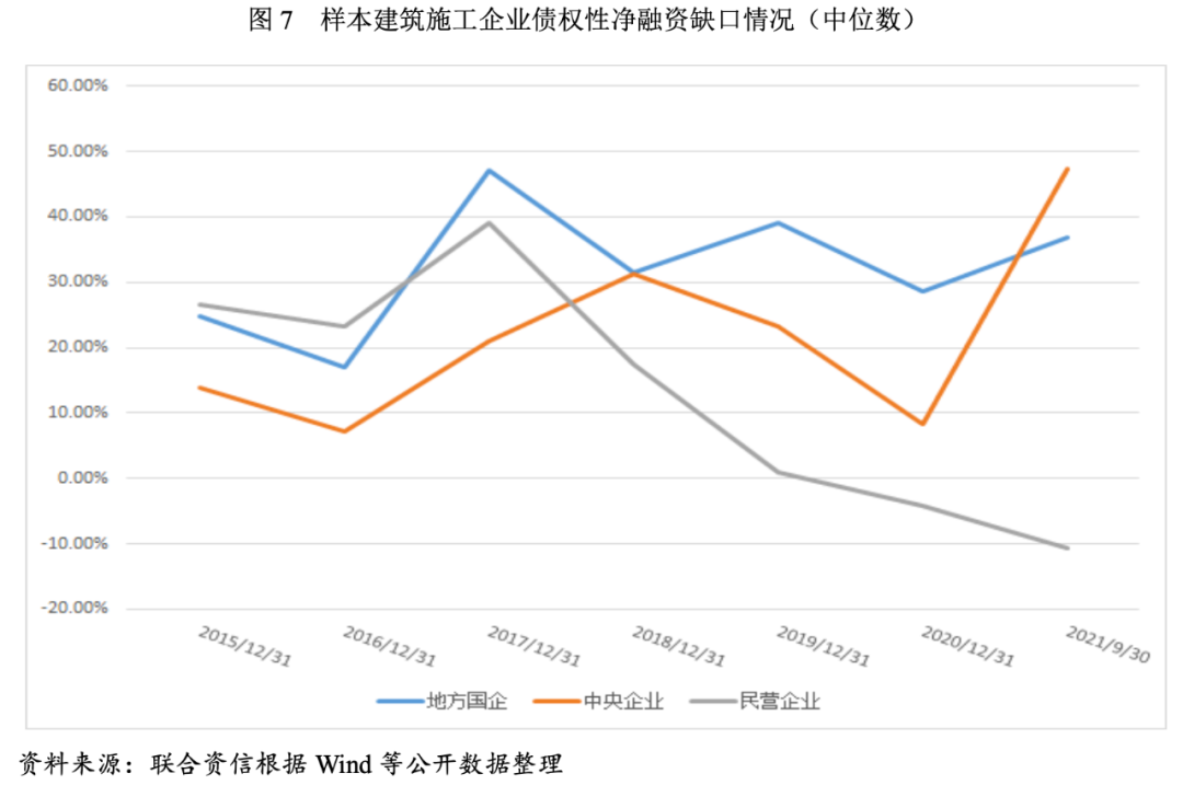 從該指標可以看出,中央企業(yè)、地方國企和民營企業(yè)的表現(xiàn)差異較大。中央企業(yè)和地方國企自2015年以來整體融資呈現(xiàn)凈融入資金狀態(tài),但區(qū)間內(nèi)波動較大,主要系與其融資需求相關。但民營建筑施工企業(yè)該指標自2017年以來快速下降,2020年轉(zhuǎn)負,為-4.25%,民營企業(yè)融資情況或受房地產(chǎn)企業(yè)信用風險的傳導影響較大。從建筑施工企業(yè)2021年前三季度的債權性融資情況來看,民營建筑施工企業(yè)債權融資性缺口繼續(xù)擴大,為-10.58%,整體融資能力持續(xù)弱化。因而作為與房地產(chǎn)企業(yè)緊密綁定的建筑施工企業(yè),其融資或受房地產(chǎn)企業(yè)信用風險的傳導影響。