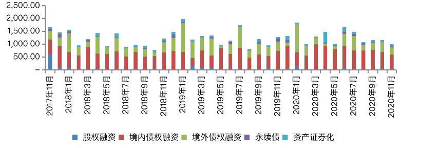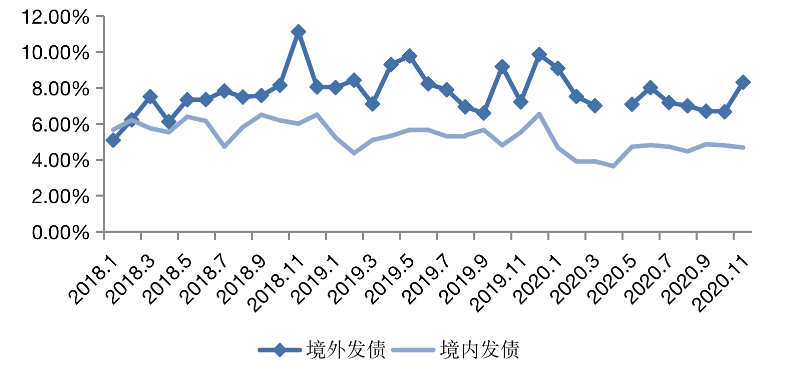 克而瑞證券數據顯示,2020年前11月,房企人民幣債累計發行10573億元,同比增加19.7%、美元債累計發行4268.2億元,同比減少23.6%。