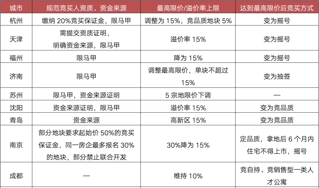 基于此,8月10日自然資源部召開閉門會議,要求集中供地城市優(yōu)化第二批次土地出讓政策,隨后,各大城市臨時中止土拍,紛紛調(diào)整土拍規(guī)則,只要涉及三大方面: