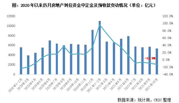 據統計局數據顯示,2021年1-10月房地產開發企業到位資金16.7萬億元,其中定金及預收款達6.2萬億元,占比達37.2%,較2020年末增加2.8個百分點。而自籌資金僅5.3萬億元,占比為31.6%,較2020年末減少1.2個百分點。不過目前來看,定金與預收款月度同比增速正在持續走低,2021年10月,定金及預收款新增5351億元,同比下降12.9%,已降至年內低位。