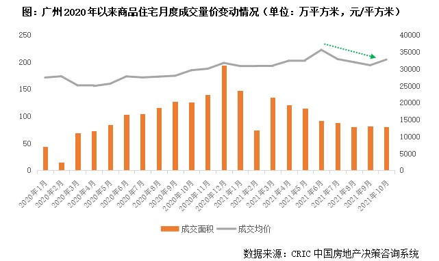 廣州2021年上半年整體樓市還是保持了較高熱度,月均成交突破100萬平,不過步入下半年便開始“急轉直下”,即便8-9月供應倍增也難挽成交頹勢,近3個月月度成交基本都在80萬平方米左右低位徘徊,月度同比降幅也一路走低至36%。
