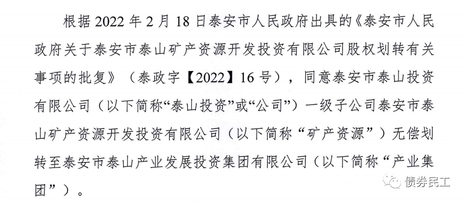 1、根據(jù)泰安市泰山投資有限公司(主體信用等級(jí)AA+)2022年2月21日的公告,將子公司泰安市泰山礦產(chǎn)資源開(kāi)發(fā)投資有限公司無(wú)償劃轉(zhuǎn)至泰安市泰山產(chǎn)業(yè)發(fā)展投資集團(tuán)有限公司。泰安市泰山產(chǎn)業(yè)發(fā)展投資集團(tuán)有限公司未發(fā)行過(guò)債券。