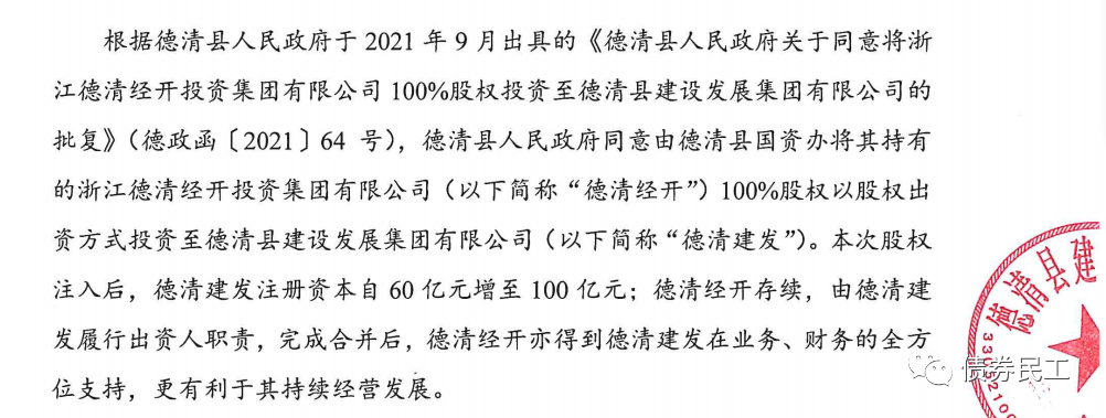 2、根據(jù)德清縣建設(shè)發(fā)展集團(tuán)有限公司(主體信用等級(jí)AA+)2022年2月10日的公告,德清縣國(guó)資辦將其持有的浙江德清經(jīng)開(kāi)投資集團(tuán)有限公司100%股權(quán)以股權(quán)出資方式投資至公司。浙江德清經(jīng)開(kāi)投資集團(tuán)有限公司主體信用等級(jí)AA,債券存量金額為12.98億元。