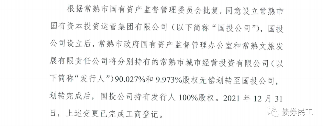 12、根據(jù)常熟市城市經(jīng)營(yíng)投資有限公司(主體信用等級(jí)AA+)2022年1月4日的公告,公司的股東變更為常熟市國(guó)有資本投資運(yùn)營(yíng)集團(tuán)有限公司。常熟市國(guó)有資本投資運(yùn)營(yíng)集團(tuán)有限公司未發(fā)行過(guò)債券。