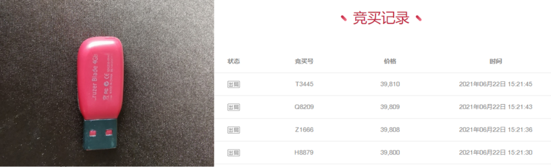 但6月21日結(jié)束時,該U盤的競買價格已升至1512元。而截至6月22日15時21分45秒,即拍賣中止前,該U盤的拍賣價格更是高達39810元,共有1186次競買,總計吸引了超29萬次圍觀。