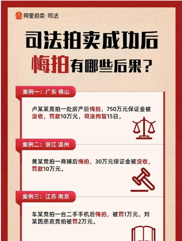 雷達財經(jīng)注意到,阿里拍賣的提示中,此前有競拍人毀約,被司法拘留15日,并罰款10萬元。