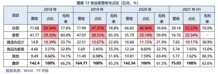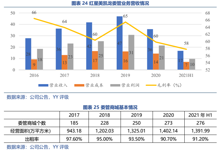 從經營表現來看:1)自營業務收入穩定,自持商場分布于一二線核心城市,但整體來說,坪效走向下坡,回報率逐年下降。2)委管業務資金占用小,有一定的利潤貢獻,但未挑起大梁,且被質疑“假委管”,存在表外負債及隱性經營兜底的風險;3)公司預打造新增長點——零售及家裝業務,但尚處于發展期,當前利潤貢獻仍十分有限,且還需持續投入資金。