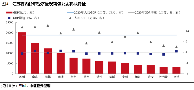江蘇省內(nèi)各市經(jīng)濟(jì)呈現(xiàn)南強(qiáng)北弱梯隊(duì)特征。從經(jīng)濟(jì)總量看,蘇州、南京、無錫和南通均為萬億GDP城市,經(jīng)濟(jì)體量大,鎮(zhèn)江、淮安、連云港及宿遷規(guī)模較小,均在5,000億以下,經(jīng)濟(jì)實(shí)力在省內(nèi)偏弱,但經(jīng)濟(jì)總量最小的宿遷市仍位列全國(guó)79位,其余各市在 5,000-8,000 億之間。從經(jīng)濟(jì)增速看,南京、南通、常州、宿遷2020年GDP增速快于江蘇省GDP增速,其余各市基本持平。從人均GDP來看,按常住人口計(jì)算,蘇南五市、南通和揚(yáng)州2020年人均GDP高于江蘇省人均GDP,其中無錫最高,達(dá)16.58萬元,南京、蘇州分別為15.91萬元和15.82萬元;鹽城、淮安、徐州、連云港、宿遷人均 GDP 較低,低于10萬元。