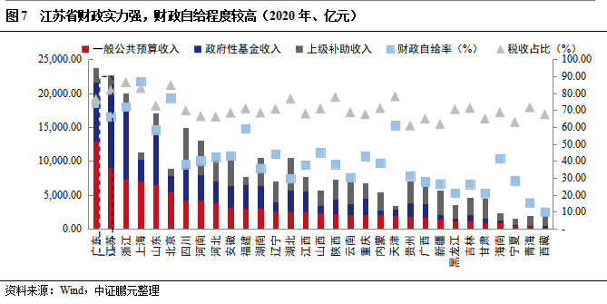 江蘇省財(cái)政實(shí)力強(qiáng),財(cái)政自給程度較高。2020年,江蘇省一般公共預(yù)算收入9,059.0億元,居全國(guó)第二,增速2.9%,其中,稅收收入7,413.9億元,占比81.8%,財(cái)政收入質(zhì)量較高;政府性基金收入11,359.4億元,總量位于全國(guó)第一,2020年同比增長(zhǎng)22.8%,增速較快,主要得益于房地產(chǎn)市場(chǎng)景氣度較高,當(dāng)年度土地出讓收入大幅增加。同期,一般公共預(yù)算支出13,682.46億元,財(cái)政自給率為66.2%,排名全國(guó)5位,相對(duì)靠前。