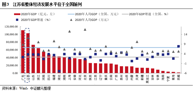 江蘇省整體經(jīng)濟(jì)發(fā)展水平較高。江蘇省與上海、浙江、安徽共同構(gòu)成長(zhǎng)三角經(jīng)濟(jì)圈,是中國(guó)發(fā)展程度最高的地區(qū)之一。從經(jīng)濟(jì)總量來看,2020年江蘇省GDP達(dá)10.27萬億,位于全國(guó)第二,僅次于廣東省,占全國(guó)GDP總量的10.14%。從經(jīng)濟(jì)增速來看,2020年江蘇省GDP增速3.7%,受疫情影響有所下滑,2021年1-9月,GDP增速恢復(fù)至10.2%,同期全國(guó)GDP增速分別為2.3%、9.8%,均高于全國(guó)水平,經(jīng)濟(jì)發(fā)展動(dòng)能足。從人均GDP來看,按常住人口計(jì)算,2020年江蘇省人均GDP達(dá)12.2萬元,是同期全國(guó)人均GDP的167.82%,排名全國(guó)第三。