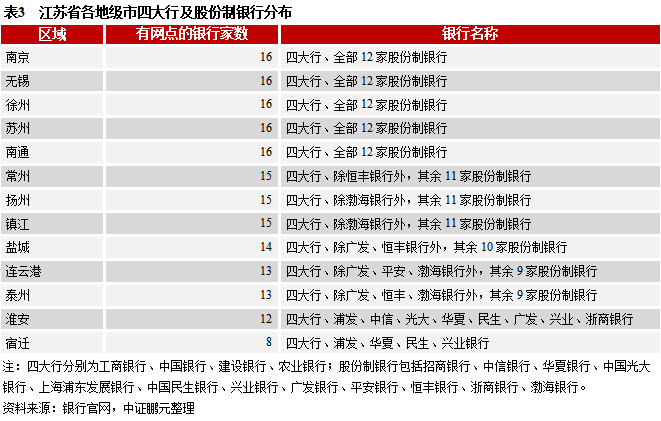城農(nóng)商銀行資源主要集中于南京和蘇州,四大行及股份制銀行分布相對(duì)均勻,淮安、宿遷網(wǎng)點(diǎn)相對(duì)較少,金融資源獲取難度相對(duì)較大。
