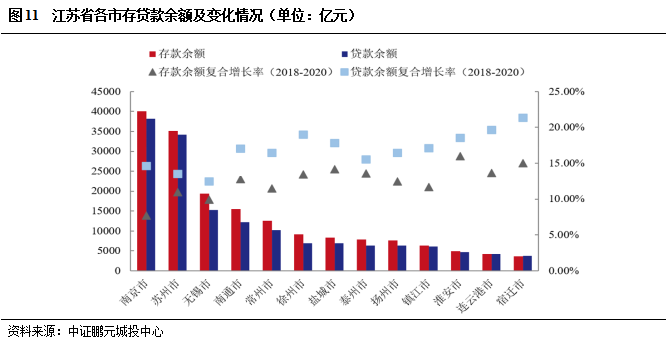 金融機(jī)構(gòu)存貸款方面,近三年江蘇省各地級(jí)市存貸款余額均呈現(xiàn)較快增長(zhǎng)態(tài)勢(shì)。截至2020年末,南京存貸款余額規(guī)模最大,其次是蘇州,資金沉淀較多。無錫、南通、常州存貸款余額超萬億,其余地級(jí)市存貸款余額在萬億以下,其中淮安、連云港、宿遷存貸款余額在5,000億以下,規(guī)模相對(duì)較小。