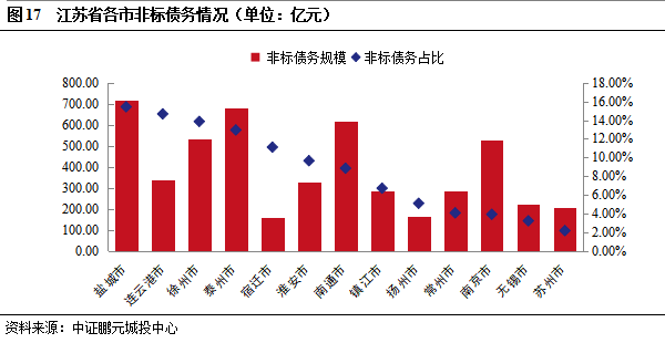 再融資利率差異明顯,非標(biāo)融資占比較高的區(qū)域債務(wù)循環(huán)壓力較大。經(jīng)中證鵬元測(cè)算,鎮(zhèn)江市、泰州市、淮安市、鹽城市城投再融資利率在6%以上,融資成本較高,而南京市和蘇州市融資利率低于5%,融資成本較低。從非標(biāo)占比來看,鹽城市、連云港、徐州、泰州、宿遷非標(biāo)債務(wù)占總債務(wù)的比例均超過10%,其中鹽城、連云港分別達(dá)15%和14%;