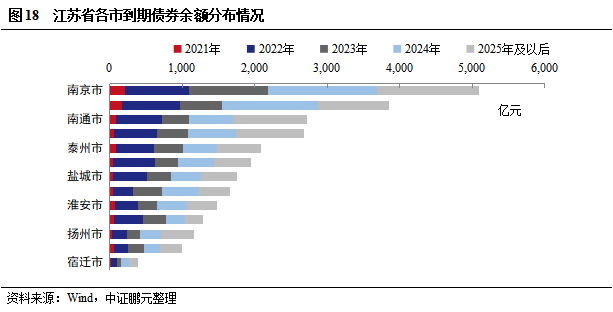 江蘇省債券到期分布總體較為均勻,鎮(zhèn)江、泰州、淮安、鹽城等存在較大的短期償付壓力。截至2021年11月3日,江蘇省城投平臺(tái)存量債券余額合計(jì)27,116億元。從到期時(shí)間來看,2022-2024年,江蘇省到期債券規(guī)模分別為5,929億元、4,944億元、7,316億元,分別占存量債券余額的21.87%、18.23%和26.98%,到期分布較為均勻。從2022年的情況來看,蘇南地區(qū)到期債券規(guī)模較大,其中南京和蘇州到期債券規(guī)模分別為876億元和800億元,而鎮(zhèn)江和常州面臨較高的到期債券占比,占其全部債券余額的比例分別為31.23%和29.65%。泰州、鎮(zhèn)江、淮安、鹽城2022年債券到期壓力較大,到期債券規(guī)模分別為其一般公共預(yù)算收入(以2020年數(shù)據(jù)測(cè)算)的1.38倍、1.29倍、1.19倍和1.16倍。