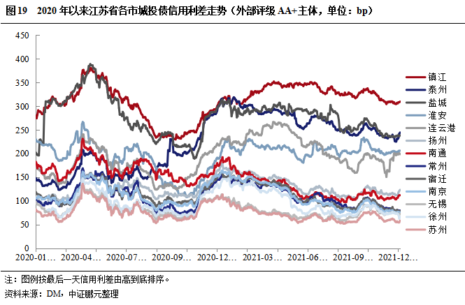 江蘇省各市城投債信用利差分化較為明顯,鎮(zhèn)江、泰州、鹽城、淮安、連云港城投信用利差較高,而蘇州、南京、無錫、常州、南通、揚(yáng)州城投信用利差相對(duì)較低,徐州和宿遷結(jié)構(gòu)分化較大,高等級(jí)(AA+)城投信用利差較低,低等級(jí)(AA)城投信用利差較高。鎮(zhèn)江、泰州、鹽城、淮安、連云港經(jīng)濟(jì)財(cái)政實(shí)力相對(duì)偏弱,城投平臺(tái)數(shù)量眾多,存在融資無序、政府管控不嚴(yán)等情況,債務(wù)規(guī)模較大,債務(wù)率較高,存在較大的償債壓力,其信用利差較高,反映了其風(fēng)險(xiǎn)補(bǔ)償情況。蘇南(除鎮(zhèn)江)、南通經(jīng)濟(jì)財(cái)政實(shí)力較強(qiáng),債務(wù)率尚可,金融資源豐富,信用利差較低。