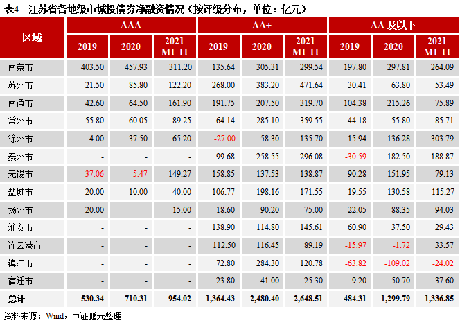 蘇南(除鎮(zhèn)江)及南通市存續(xù)債規(guī)模較大,且債券發(fā)行下沉較為明顯,泰州、連云港和鎮(zhèn)江低等級(jí)城投平臺(tái)出現(xiàn)凈融資為負(fù)情況。截至2021年12月7日,蘇南(除鎮(zhèn)江)及南通五市存續(xù)債余額占全省的60%,且整體低資質(zhì)發(fā)行較為通暢,下沉明顯。而AA及以下城投平臺(tái)中,淮安、宿遷凈融資額較小,泰州、連云港、鎮(zhèn)江出現(xiàn)凈融出情況,市場(chǎng)認(rèn)可度較低。