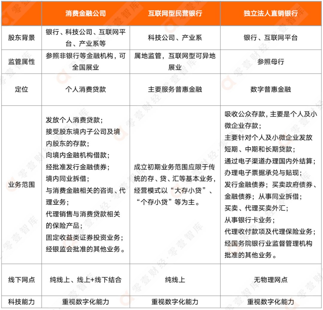 從監管屬性來看,消費金融公司、互聯網型民營銀行、獨立法人直銷銀行均是可以全國展業的。經營模式來看,經歷疫情以后,消費金融公司基本轉為線上+線下結合的模式或是純線上模式,純線上模式的消費金融公司完全符合數字銀行的要求。