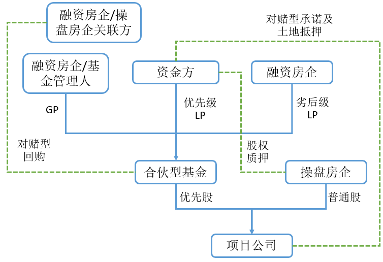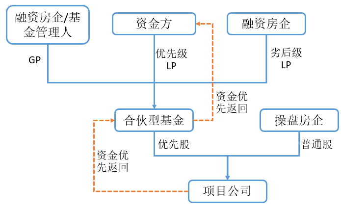 (1)資金方可通過自行設立或合作設立等方式,與融資房企和其他外部基金管理人共同設立合伙型地產基金,其中資金方可擔任合伙型地產基金優先級LP,同時可根據底層項目需要決定是否擔任合伙型基金GP,融資房企擔任劣后級LP。合伙型基金設立后,與項目公司操盤房企共同持有項目公司,合伙型基金可視需要持有項目公司優先股。