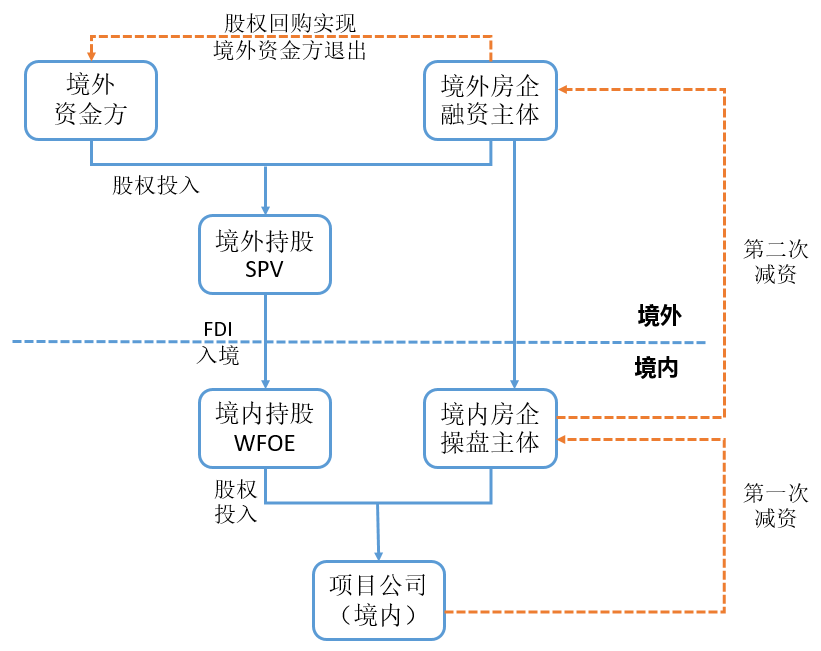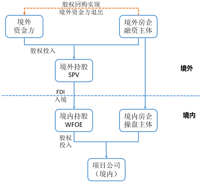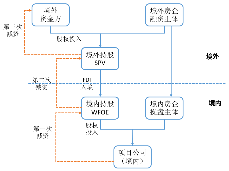 境外真股融資模式與境內的真股融資模式路徑相同,同樣是由境外資金方與境外融資房企在境外設立SPV,雙方的資金由境外持股SPV通過FDI途徑將資金實繳至境內持股外商投資企業,隨后該境內持股WFOE與境內操盤房企主體共同持有項目公司股權并開發項目。資金的入境路線如下: