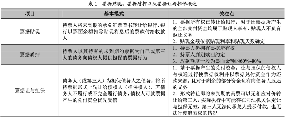 在我國實體經(jīng)濟發(fā)展過程中,對于中小企業(yè)來說,以票據(jù)貼現(xiàn)方式進行融資手續(xù)簡單且融資成本較低,應(yīng)用較為普遍。在此基礎(chǔ)上,為免疑義,在進入主要話題前,以下概念需要先進行區(qū)分:票據(jù)讓與擔(dān)保、票據(jù)貼現(xiàn)以及票據(jù)質(zhì)押(具體內(nèi)容詳見下表)。