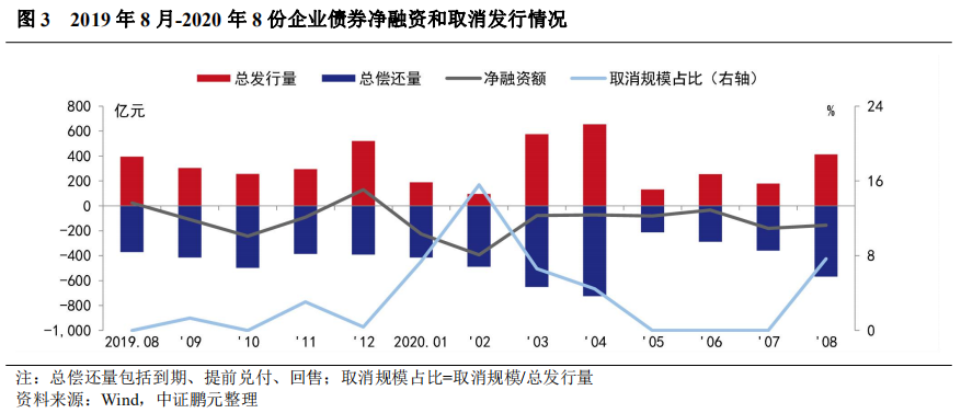 從凈融資情況來看,8月企業債券總發行規模413.09億元,總償還規模569.03億元,本月表現為凈償還155.94億元,連續8個月表現為凈償還。此外,2020年8月有4只企業債券取消發行,原計劃發行規模合計31.70億元。2020年1-8月份,企業債凈融資-1,219.99億元,較上年同期凈償還量增加213.76億元,累計取消發行企業債15只,原計劃發行規模127.80億元。