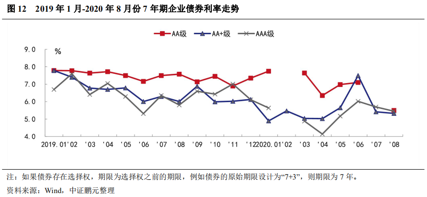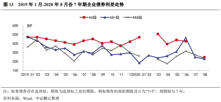 與上月相比,2020年8月,7年期企業債各級別的平均發行利率均下行,其中,AAA級下行25BP, AA級下行9BP;利差方面,AAA級和AA+級分別收窄37BP和20BP。