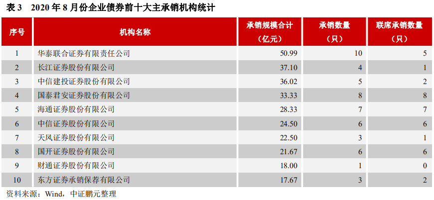 就承銷機構而言,2020年8月共有28家機構參與企業債券的承銷工作。華泰聯合承銷50.99億元,位居第一;長江證券以承銷37.10億元位居第二,中信建投承銷36.02億元,位居第三。前五大承銷商,承銷規模合計占比45%。