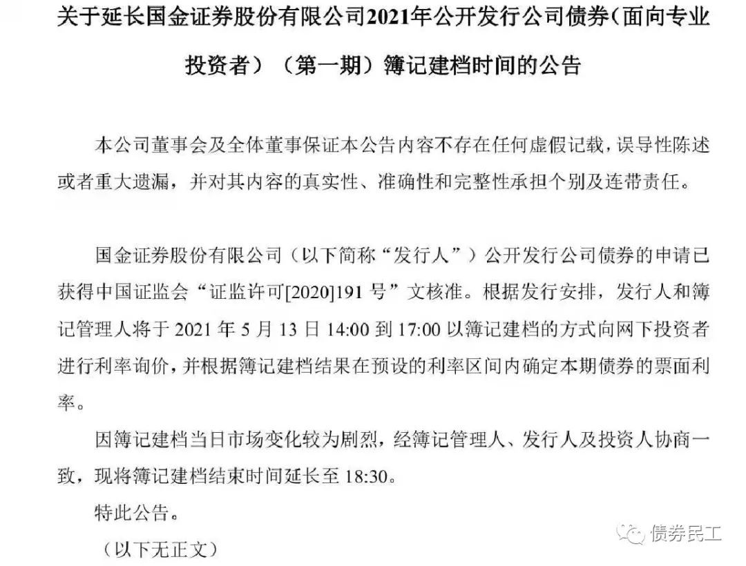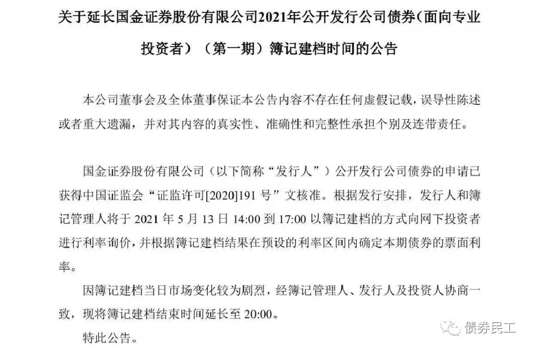 1、國(guó)金證券股份有限公司公告了2021年公開發(fā)行公司債券(面向?qū)I(yè)投資者)(第一期)(21國(guó)金01,基礎(chǔ)發(fā)行規(guī)模10億元,可配售不超過20億元)延長(zhǎng)簿記建檔時(shí)間的公告,將簿記建檔時(shí)間延長(zhǎng)到18:30,然后又披露了第二個(gè)延長(zhǎng)公告,將簿記建檔時(shí)間延長(zhǎng)至20:00。