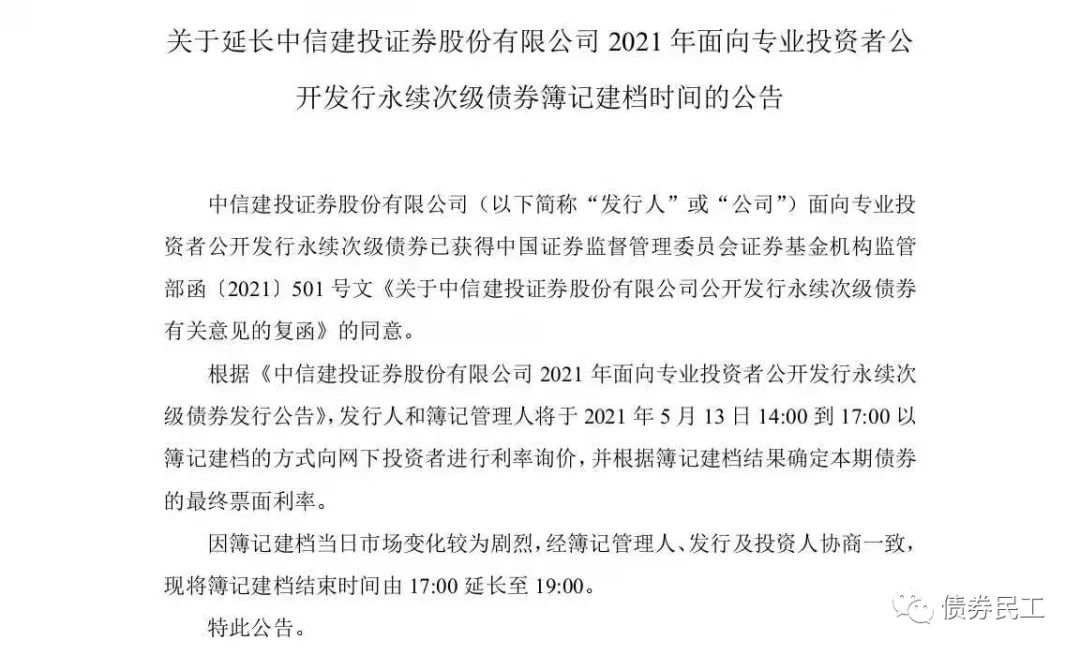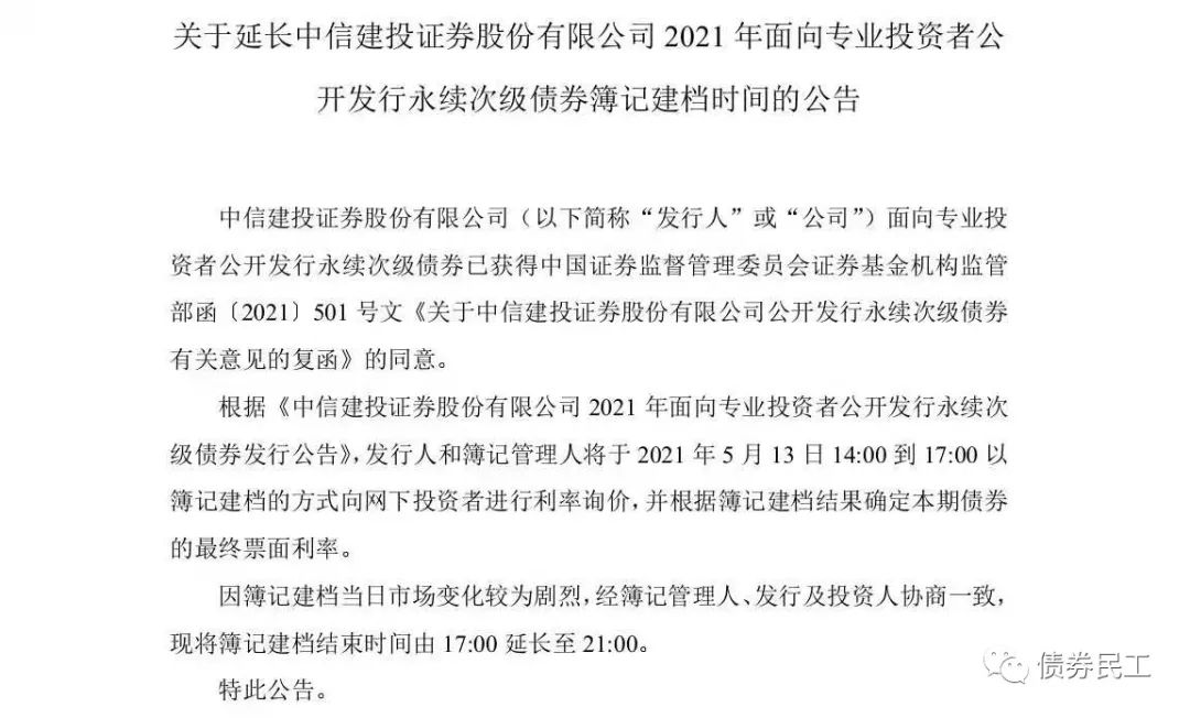 3、中信建投證券股份有限公司公告了2021年面向?qū)I(yè)投資者公開發(fā)行永續(xù)次級(jí)債券(21信投Y1,發(fā)行規(guī)模不超過50億元)延長(zhǎng)簿記建檔時(shí)間的公告,將簿記建檔時(shí)間延長(zhǎng)到19:00,然后又披露了第二個(gè)延長(zhǎng)公告,將簿記建檔時(shí)間延長(zhǎng)至21:00。