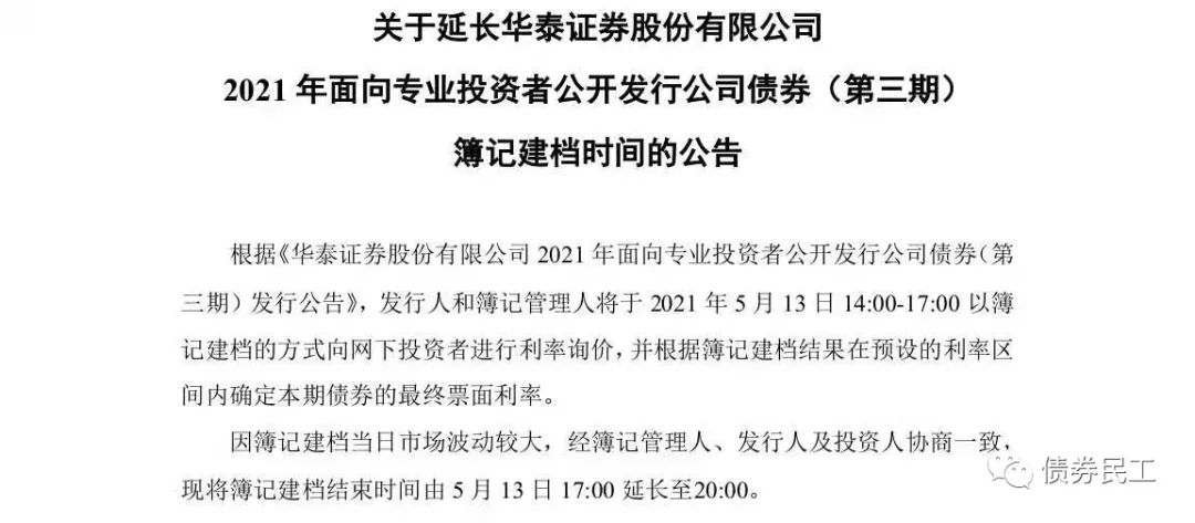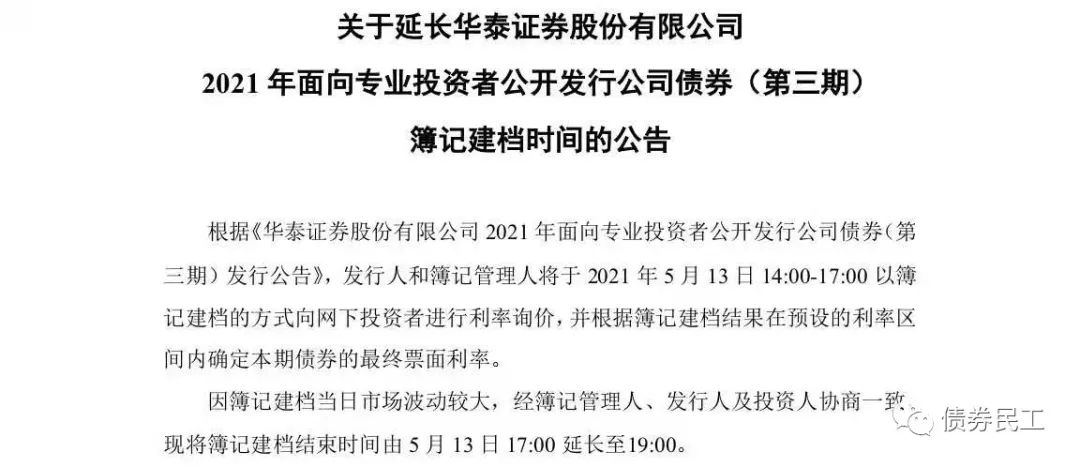 2、華泰證券股份有限公司公告了2021年面向?qū)I(yè)投資者公開發(fā)行公司債券(第三期)(21華泰G4,發(fā)行規(guī)模不超過60億元)延長(zhǎng)簿記建檔時(shí)間的公告,將簿記建檔時(shí)間延長(zhǎng)到19:00,然后又披露了第二個(gè)延長(zhǎng)公告,將簿記建檔時(shí)間延長(zhǎng)至20:00。