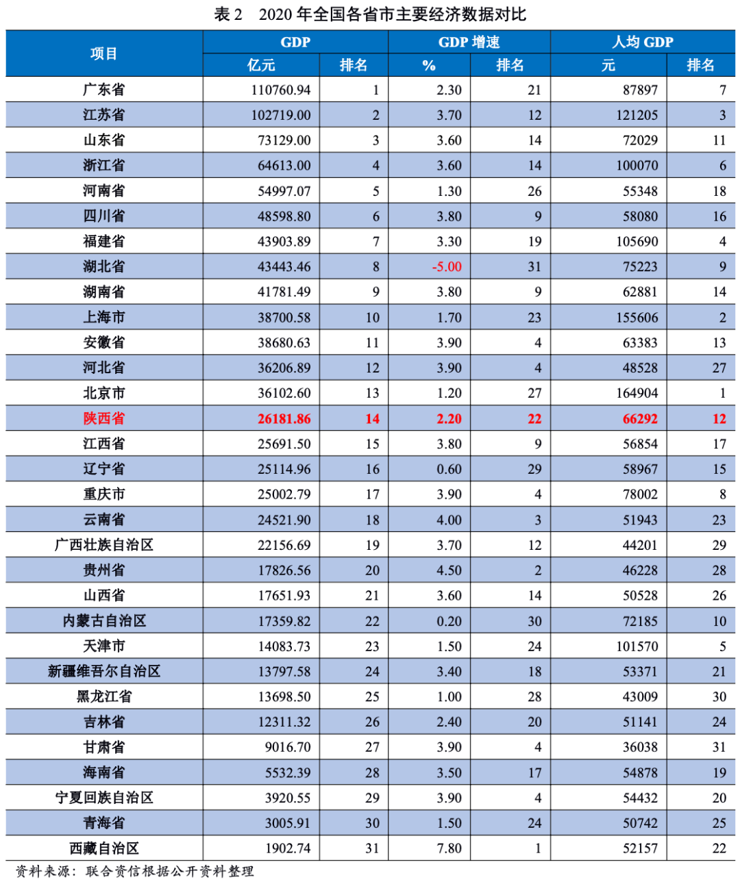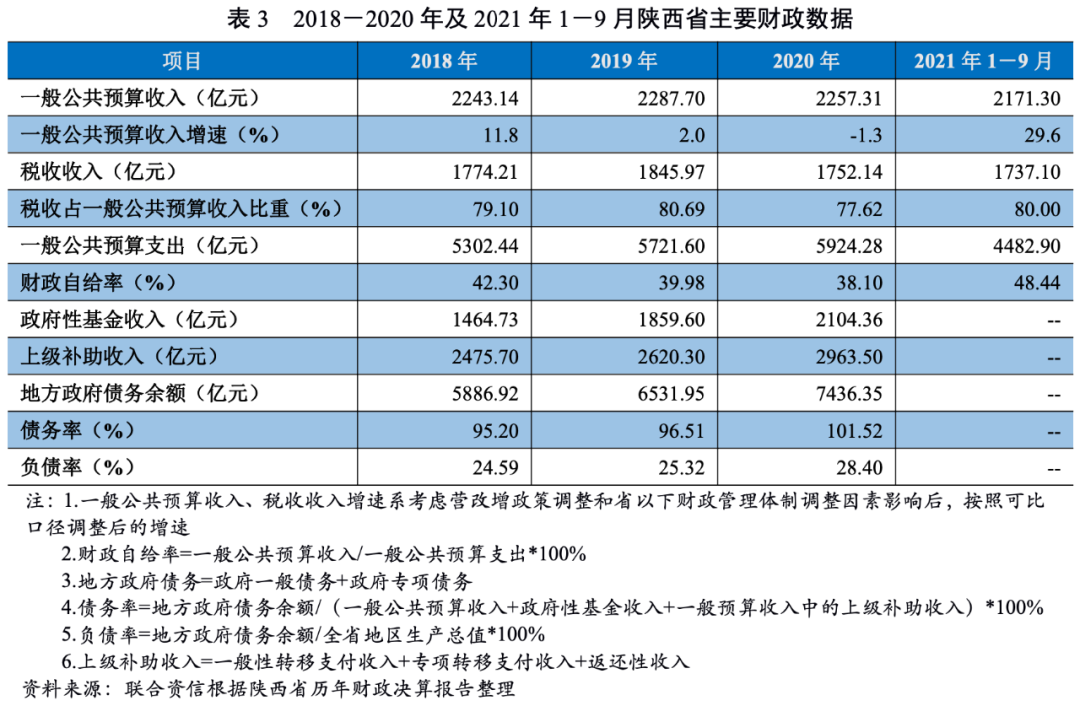 陜西省經濟總量和人均GDP保持全國中游水平。2020年,受新冠肺炎疫情影響,陜西省經濟增速有所放緩,2021年1-9月呈恢復性增長,但固定資產投資后勁不足,整體投資呈負增長狀態。陜西省政府債務余額持續增長,2020年末排名全國第17位,政府債務率與負債率均處于全國中游水平,政府債務風險可控。