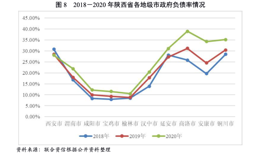債務負擔方面,2018-2020年,除西安市外,其他地級市政府負債率均呈增長態勢。2020年,商洛市政府負債率為省內最高(38.92%),較上年增長7.77個百分點,商洛市政府負債率增長最快(同比上升9.76個百分點)。同期,榆林市、寶雞市和咸陽市政府負債率均低于20%。