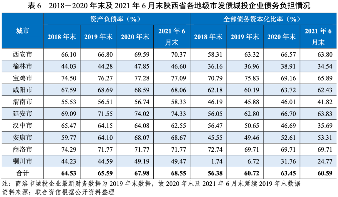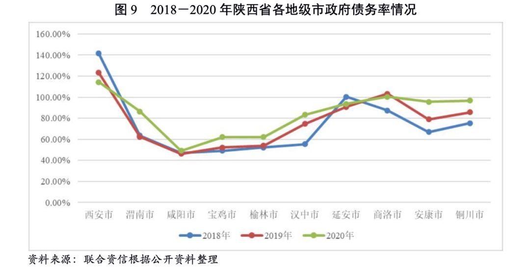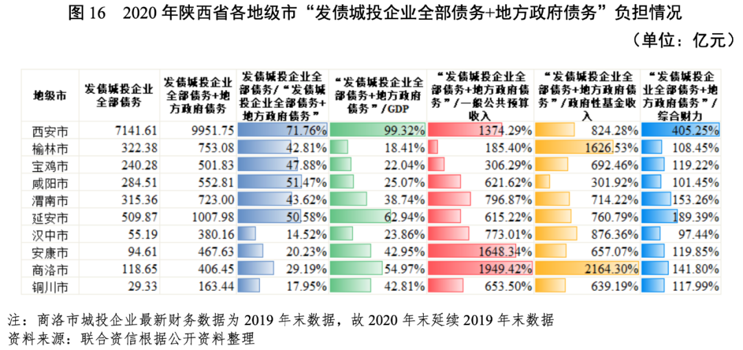 從各地區債務負擔來看,“發債城投企業全部債務+地方政府債務”/GDP最高的地級市為西安市,達99.32%;其次為延安市的62.94%和商洛市的54.97%;其他區域均低于50.00%,其中榆林市的比值最低,僅為18.41%。