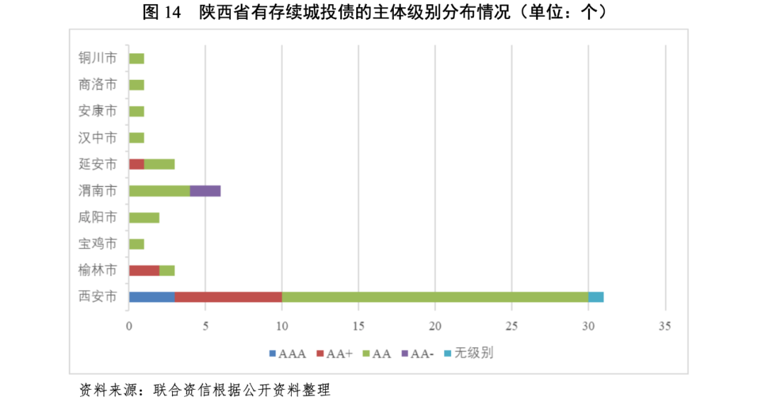 陜西省發債城投企業數量相對較少,信用等級以AA為主,AA+及以上的發債城投企業集中在西安市、榆林市和延安市。從行政區域看,陜西省發債城投企業集中在西安市,且以園區類城投企業為主。