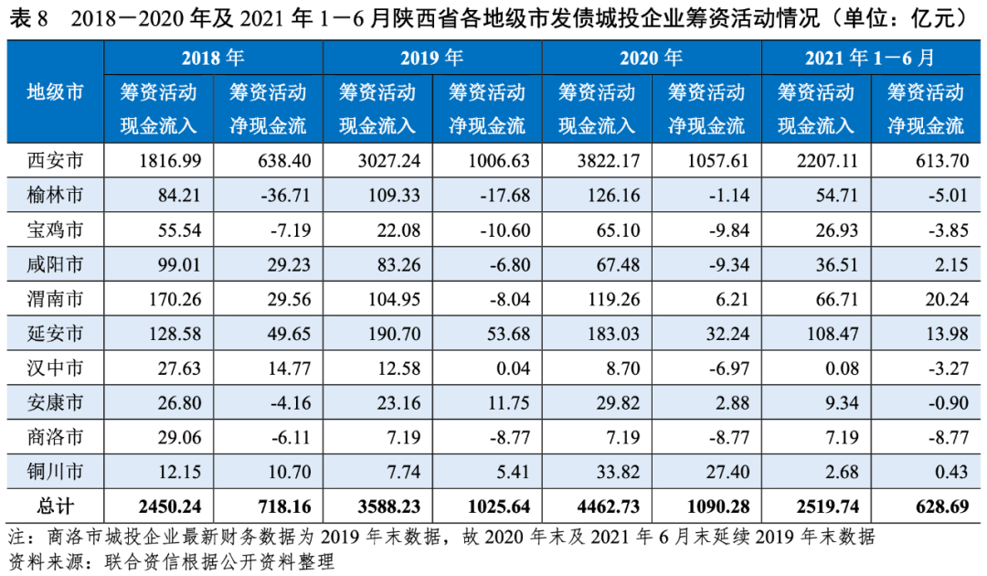 2020年以來,陜西省大部分發債城投企業債務負擔有所上升,貨幣資金對短期債務的覆蓋程度有所下降,其中咸陽市、延安市和漢中市短期償債能力相對較弱。