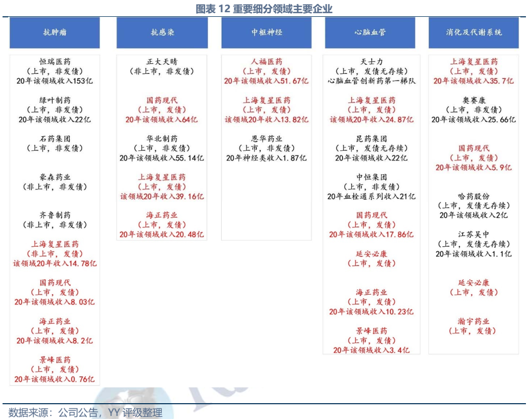 目前國內醫藥市場仍主要以包括化學藥劑和生物藥在內的西藥為主導,且大部分以仿制藥為主。創新藥研發方面主要形成四大集群,不過整體在債市的存在感不高。競爭格局方面,抗腫瘤、抗感染、心血管、中樞神經以及消化代謝系統領域占藥品市場規模60%以上,各領域企業眾多,具備一定市場地位的公司多為上市公司,如抗腫瘤領域主要有恒瑞醫藥、綠葉制藥、石藥集團、泰森制藥,抗感染領域主要有正大天晴、國藥現代、華北制藥、復星醫藥、海正藥業。