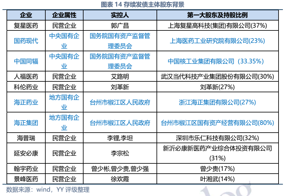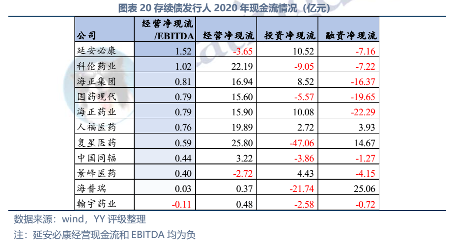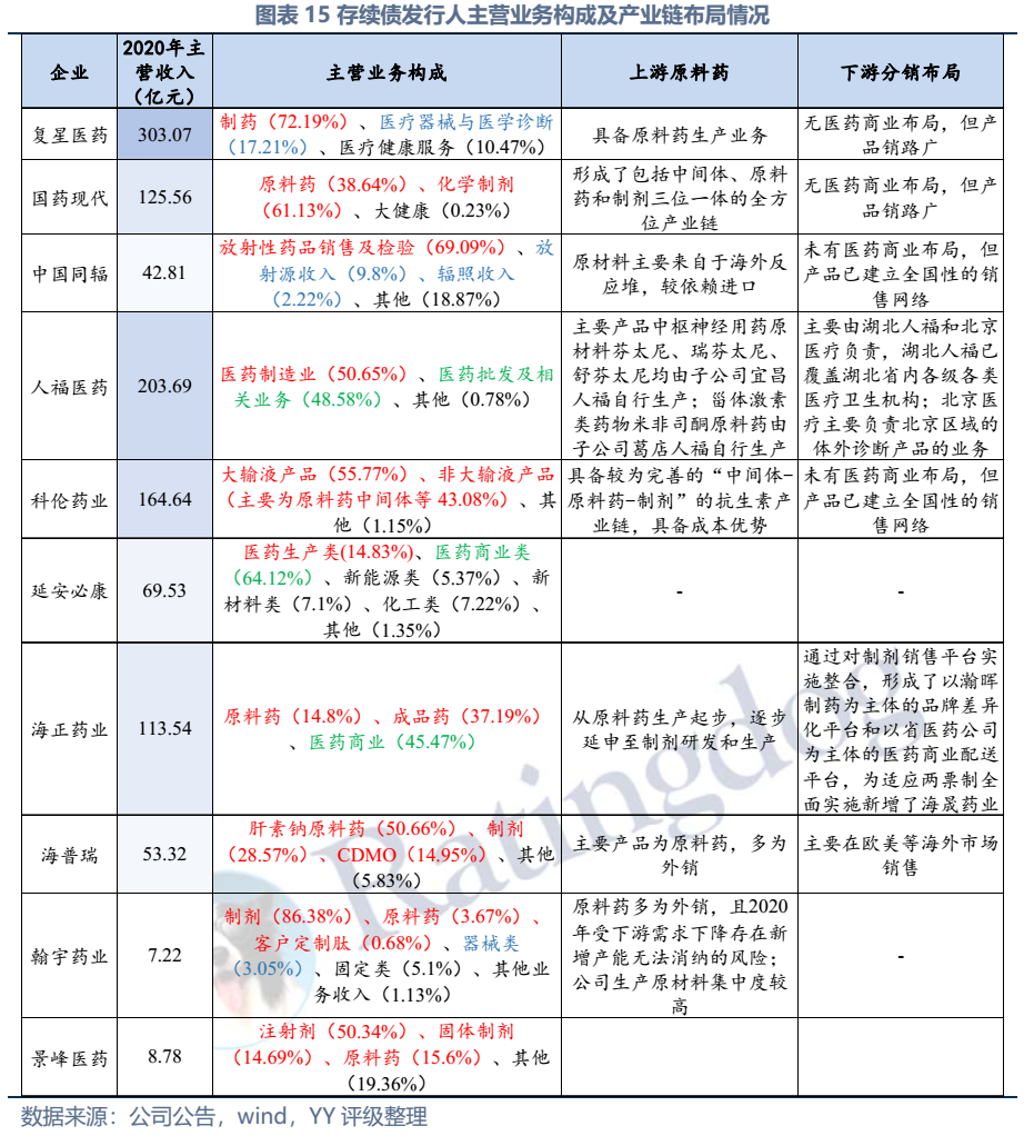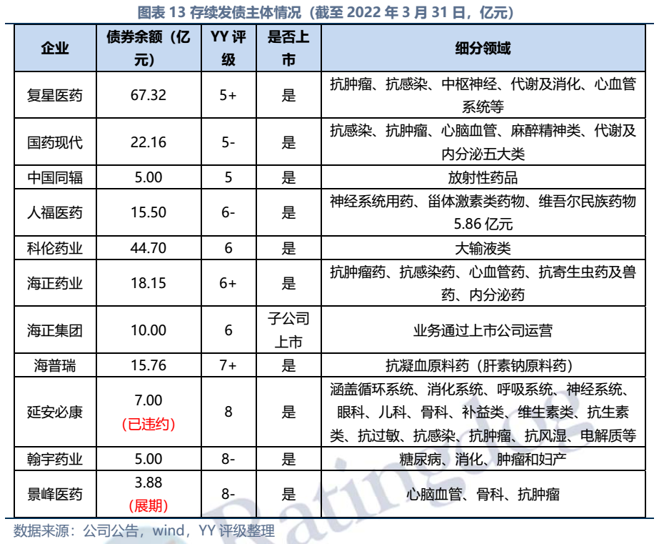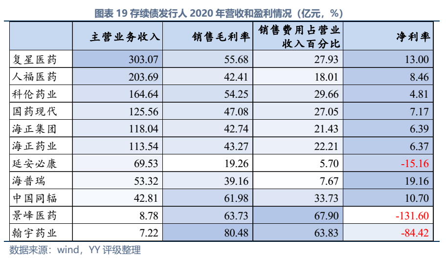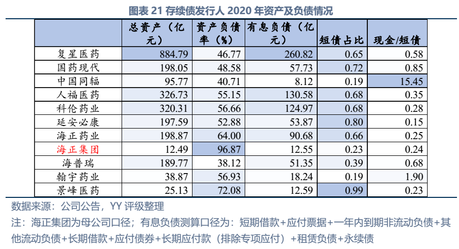 截至2022年3月末西藥行業發債主體存續債券余額僅214億元,存續債主體11家(含已違約的延安必康、已展期的景峰醫藥),具體來看:復星醫藥、國藥現代、人福醫藥、海正藥業、延安必康、翰宇藥業和景峰藥業擁有較多樣化的產品布局,復星醫藥(在抗感染、中樞神經和消化系統)、國藥現代(在抗感染、心腦血管)和人福醫藥(在心腦血管)具備較高的行業地位,中國同輻、科倫藥業和海普瑞產品則多聚焦于某一細分領域。財務方面,整體銷售毛利率較高(平均約50%),但銷售費用對利潤侵蝕較大(銷售費用/營收平均30%),存續發行人中除延安必康、景峰醫藥和翰宇藥業凈利潤出現虧損外,其他表現尚可;資產及負債方面,復星醫藥總資產顯著高于其他企業,規模優勢顯著;海正集團本部杠桿率很高,需關注債務壓力;行業整體短債占比較高,存在一定流動性壓力。