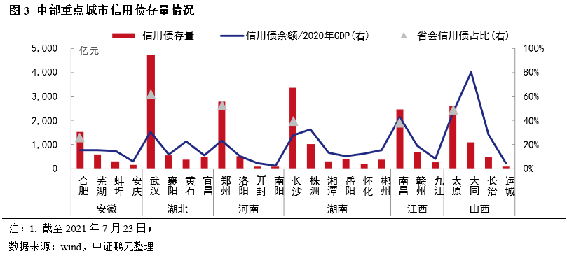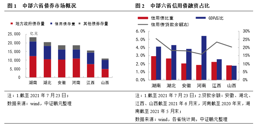 截至2021年7月23日,中部六省的存量債券余額10.75萬億元,其中地方政府債5.68萬億元,占全國地方政府債總余額的21%,信用債(含ABS)3.93萬億元,占全國信用債總余額的13%。
