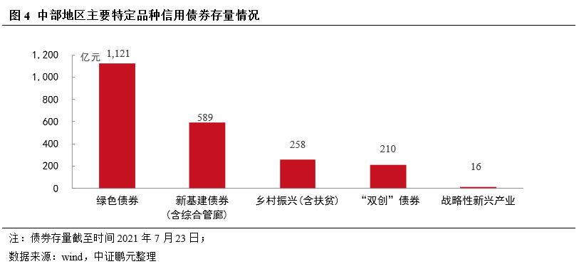 根據《意見》,綠色債券、鄉村振新債券(含扶貧)、“雙創”債券、戰略性新興產業專項債券、新型基建領域專項債券等特定品種債券可成為中部地區高質量發展的推手。上述特定品種信用債券,中部地區的存量余額為2,193.59億元,占全國總余額的16%,略低于區域全部信用債18%的占比,仍有較大提升潛力。綠色債券、新基建(含綜合管廊)專項債是現階段主要的特定品種債券,其中綠色債券存量余額1,120.90億元,遠高于其他特定品種債券種類?!兑庖姟分卸啻翁岬健熬G色”相關概念,堅持綠色發展和實現碳中和也是我國長期國策。在政策支持和鼓勵下,中部地區利用創新債券品種的水平將進一步提升。