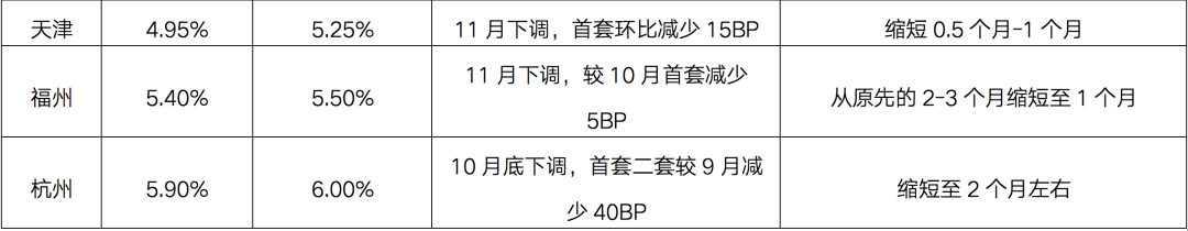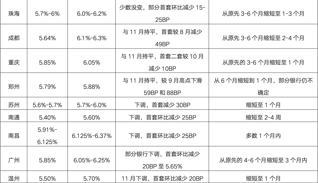 部分地區(qū)人民銀行分支行響應(yīng),開始對房地產(chǎn)信貸進行窗口指導(dǎo),支持房貸政策適度松綁。近日多個熱點城市的按揭出現(xiàn)階段性回暖現(xiàn)象,放貸速度有所加快,從前期的“不確定”、“3-6個月基本是常態(tài)”已經(jīng)調(diào)整為“1-3個月內(nèi)”,而如杭州、蘇州、寧波、廣州、武漢、合肥、成都、鄭州和天津等熱點城市的房貸利率也較9月高點有明顯下調(diào),11月居民中長期貸款顯著增長。