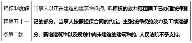 對(duì)此, 新出臺(tái)的《民法典》及最高人民法院關(guān)于適用《中華人民共和國(guó)民法典》有關(guān)擔(dān)保制度的解釋(以下簡(jiǎn)稱“擔(dān)保制度解釋”)對(duì)此給出了確定的回答: 在建工程抵押權(quán)的效力不及于續(xù)建部分、新增建筑物以及規(guī)劃中尚未建造的建筑物。