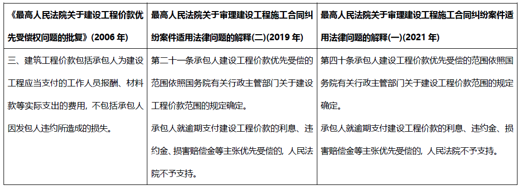 此外, 此前的《批復(fù)》、最高人民法院于2018年頒布、2019年實(shí)施的現(xiàn)已失效的關(guān)于審理建設(shè)工程施工合同糾紛案件適用法律問題的解釋(二)(以下簡(jiǎn)稱“已失效建設(shè)工程合同解釋”)與現(xiàn)在的《建設(shè)工程合同解釋一》均明確將逾期支付建設(shè)工程價(jià)款的違約責(zé)任排除在優(yōu)先受償?shù)姆秶? 因此, 金融機(jī)構(gòu)作為抵押權(quán)人更應(yīng)當(dāng)關(guān)注的是承包人主張的工程價(jià)款是否包含了利息、違約金、損害賠償金等不屬于工程支出的費(fèi)用。